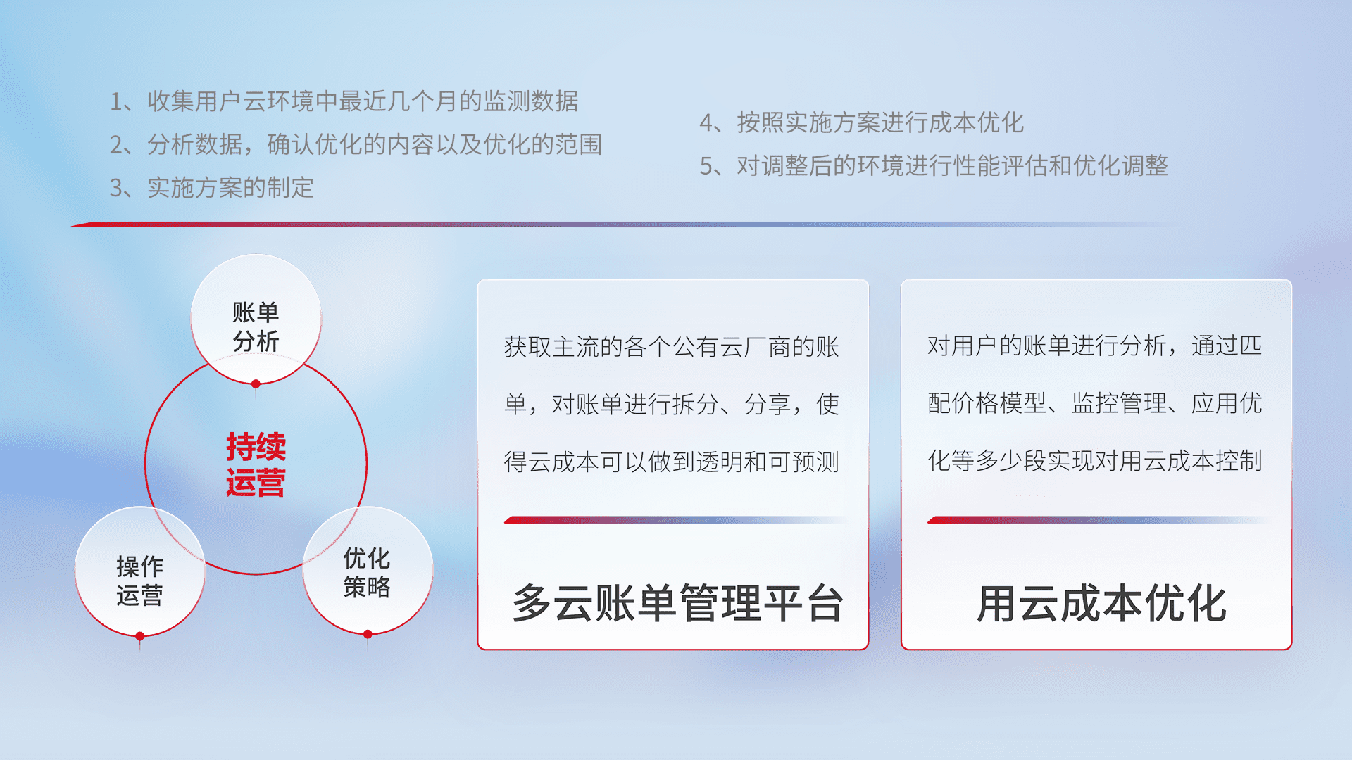 通过多云纳管,,以统一的资源数据模型把客户的云资源进行抽象和封装,,,,进而实现对多云资源的统一操作,,,,保障云资源管理的可靠性、、、稳定性与可用性。。量身定制化运维内容,,,,配置、、、、开发运维、、补丁管理、、、备份、、监控、、、认证和访问管理、、、、审计和日常巡检等,,,,保障在用云过程中的可靠度,,稳定度以及高可用率。。。。